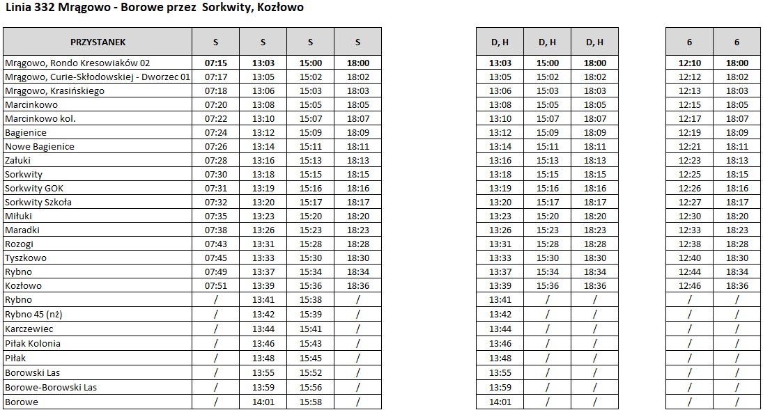 Strona główna/Transport publiczny/332 | Mrągowo – Borowe przez Sorkwity, Kozłowo.